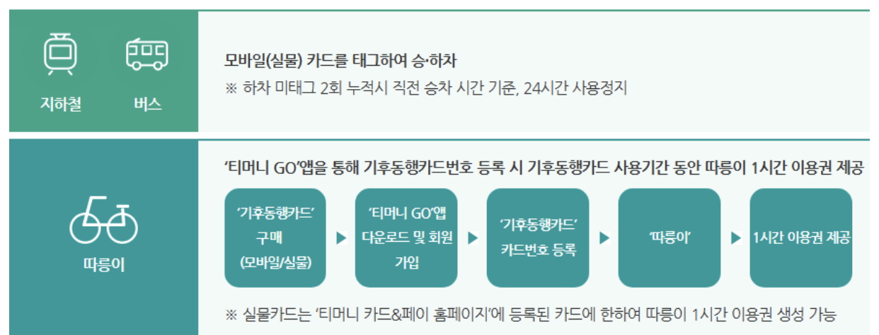 ๊ธฐํ๋ํ์นด๋๋ 2024๋ 1์ 23์ผ๋ถํฐ ํ๋งคํ๋ฉฐ 1์ 27์ผ ์ฒซ์ฐจ๋ถํฐ ์ฌ์ฉ์ด ๊ฐ๋ฅํ๊ธฐ ๋๋ฌธ์, ๋ฏธ๋ฆฌ ๊ตฌ๋งคํ์ ์ ๋ฑ๋ก ๋ฐ ์ถฉ์ ํด๋์๋ฉด ํธ๋ฆฌํ๊ฒ ์ฌ์ฉํ์ค ์ ์์ต๋๋ค. ๋ฑ๋ก ๊ฐ์์ผ์ ์ถฉ์ ์ผ์ ํฌํจํ์ฌ 5์ผ ์ด๋ด ์ฌ์ฉ์์์ผ์ ์ง์ ํ ์ ์์ผ๋ฉฐ, 30์ผ ๋์ ์ด์ฉ์ด ๊ฐ๋ฅํฉ๋๋ค.