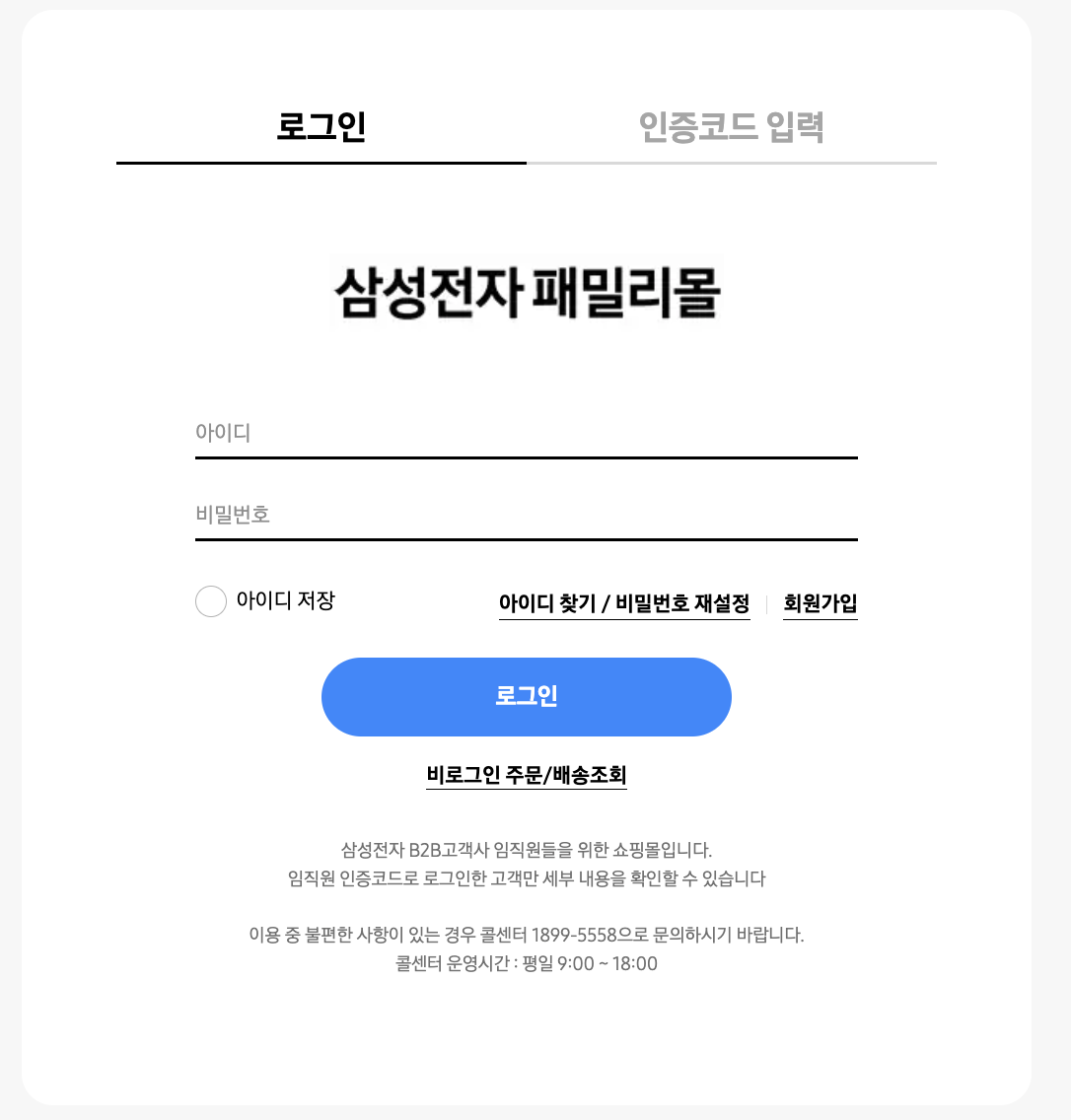 ์ผ์ฑ์ ์ ํจ๋ฐ๋ฆฌ๋ชฐ์ ๋๊ตฌ๋ ๋ค์ด๊ฐ ์ ์๋ ๊ณต๊ฐ ์ผํ๋ชฐ์ด ์๋๋ผ, ํน์ ์กฐ๊ฑด์ ์ถฉ์กฑํด์ผ๋ง ๊ฐ์ ํ ์ ์๋ ๋น๊ณต๊ฐ ์ ์ฉ ์จ๋ผ์ธ๋ชฐ์ ๋๋ค. ํนํ ๊ตฐ์ธ ์ธ์ฆ์ ๋ง์น๋ฉด TV, ๋์ฅ๊ณ , ์ธํ๊ธฐ, ์ค๋งํธํฐ ๋ฑ ์ฃผ์ ๊ฐ์ ์ ๊ตฐ์ธ ์ ์ฉ ํน๊ฐ๋ก ๊ตฌ์ ํ ์ ์์ต๋๋ค.